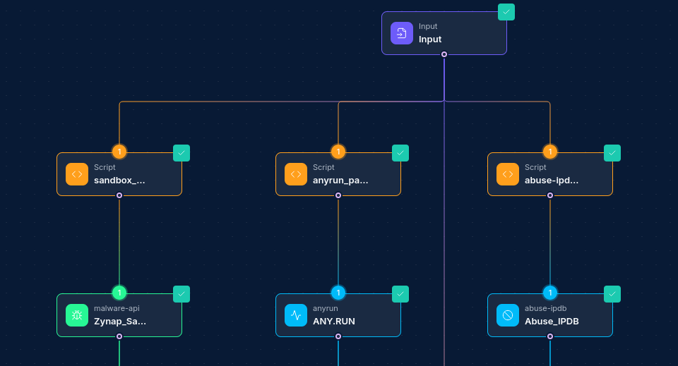 - Email Integration Node → Script Node (extract attachment) → ANY.RUN Integration Node (analysis) → If/Else Node (check verdict) → Slack/Jira Node (notification)